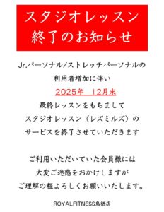 スタジオレッスン(レズミルズ)終了のお知らせ【鳥栖店】